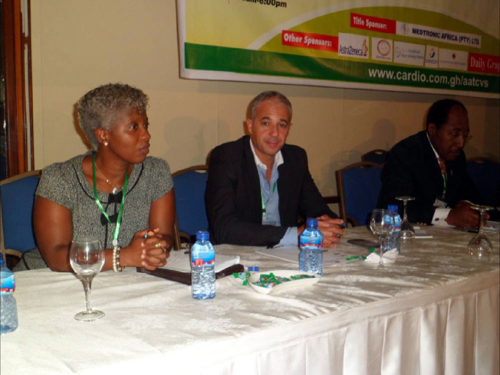 Première conférence internationale de l'AATCVS, en présence du MINISTRE DE LA SANTÉ DU GHANA, assis à la table haute avec le Professeur Yangni-Angate et le Dr Sereboe lors de la cérémonie d'ouverture. Les photos incluent des images du public et des conférenciers d'Afrique.